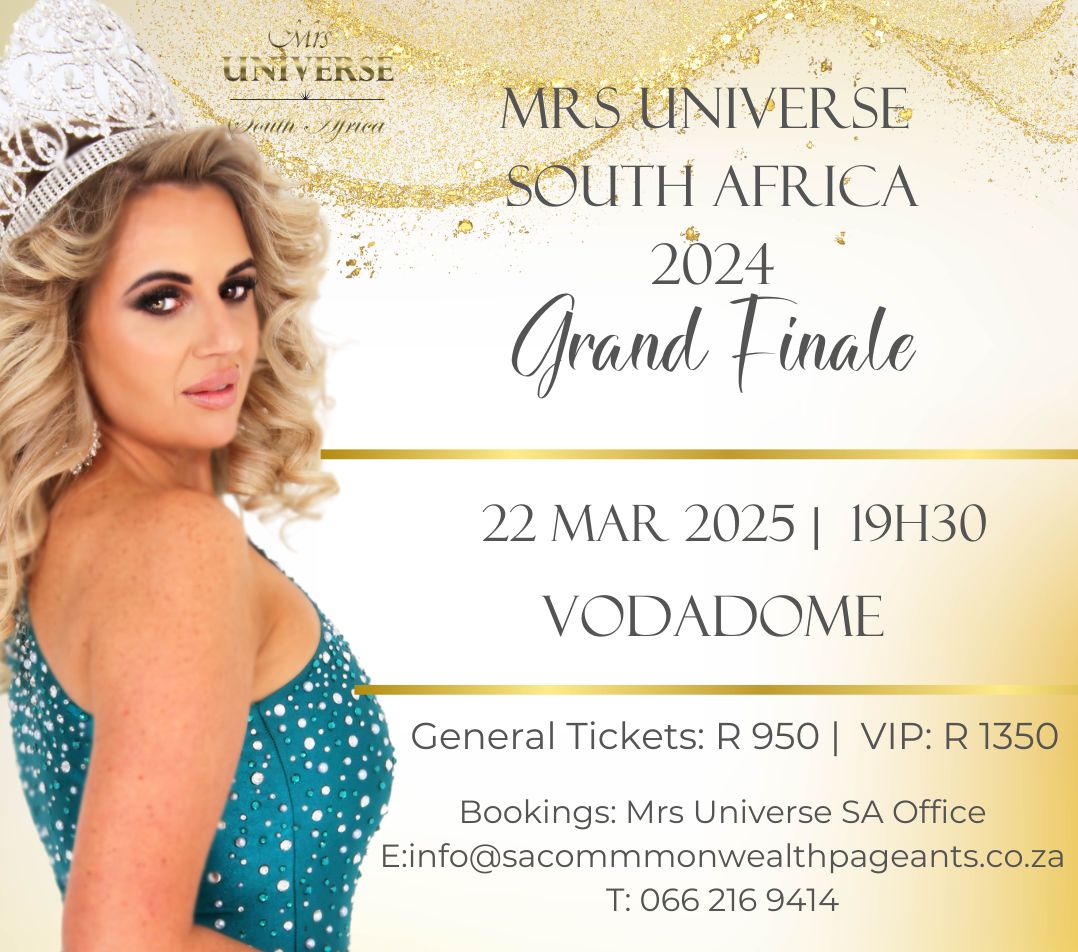 Join us on the 22nd of March 2025 at the iconic Vodadome for the spectacular Mrs. Universe South Africa Grand Finale! This prestigious event promises an unforgettable evening of elegance, empowerment, and celebration as the top finalists take the stage to showcase their strength, beauty, and ambition. Be part of the magic and witness the crowning of the next Mrs. Universe South Africa in an evening filled with glitz, glamour, and inspiration. Tickets are limited, so secure yours today and let’s come together to celebrate the phenomenal women of South Africa!